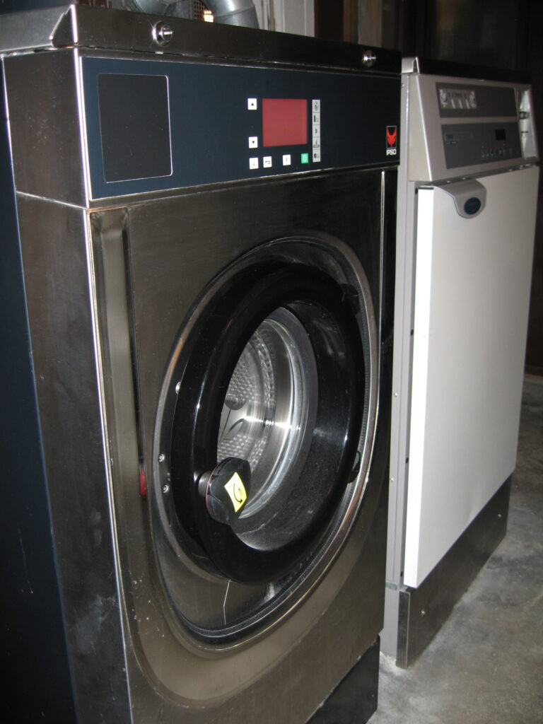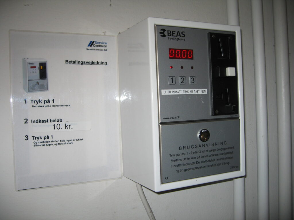 Her er 3 nyere maskiner. Vaskemaskine, tørretumbler og centrifuge. Betaling er med 10kroner, og prisen fremgår af displayet. Der er ingen tidsbestilling, og fungerer efter først til mølleprincippet.